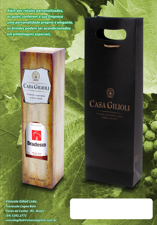Com o logotipo de vossa empresa podemos divulgar e valorizar ainda mais sua marca alem de ser um presente de bom gosto os Vinhos Casa Gilioli tem ótima qualidade e com certeza, ira agradar o seu cliente.
